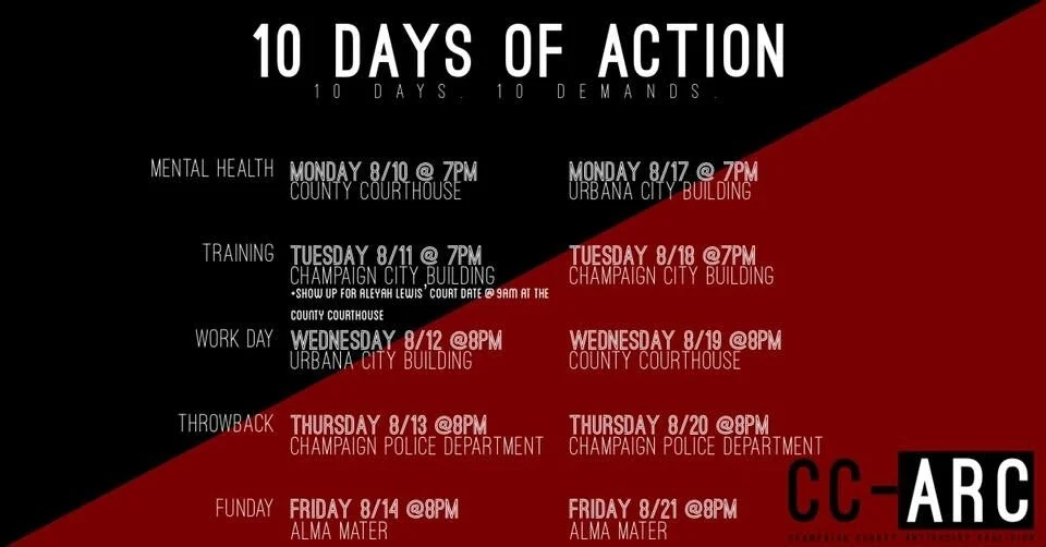 The Champaign County Anti-Racist Coalition (ARC) 10 Days of Action is kicking off today! The 10 demands are: defund the police, community control, housing for all, no jail expansion, no cops in schools, childcare for all, healthcare for all, end ICE raids, bias training, and people first policy. See more info & share on CCARC's Facebook page and Twitter.