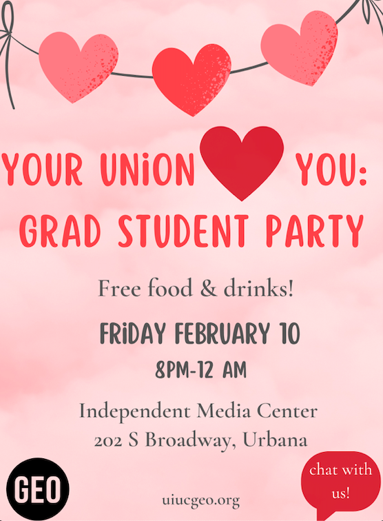 [image description: Pink Flyer with string of red and pink hearts at the top. Pink lettering below that reads: “Your Union <3’s You: Grad Student Party.” Below that in gray says: Free Food and Drinks Friday February 10th 8PM - 12AM Independent Media Center 202 S Broadway, Urbana. There is a black/pink GEO logo in the bottom right corner. In the bottom left corner, a speech bubble says “Chat with us” next to a link to the GEO website: uiucgeo.org]