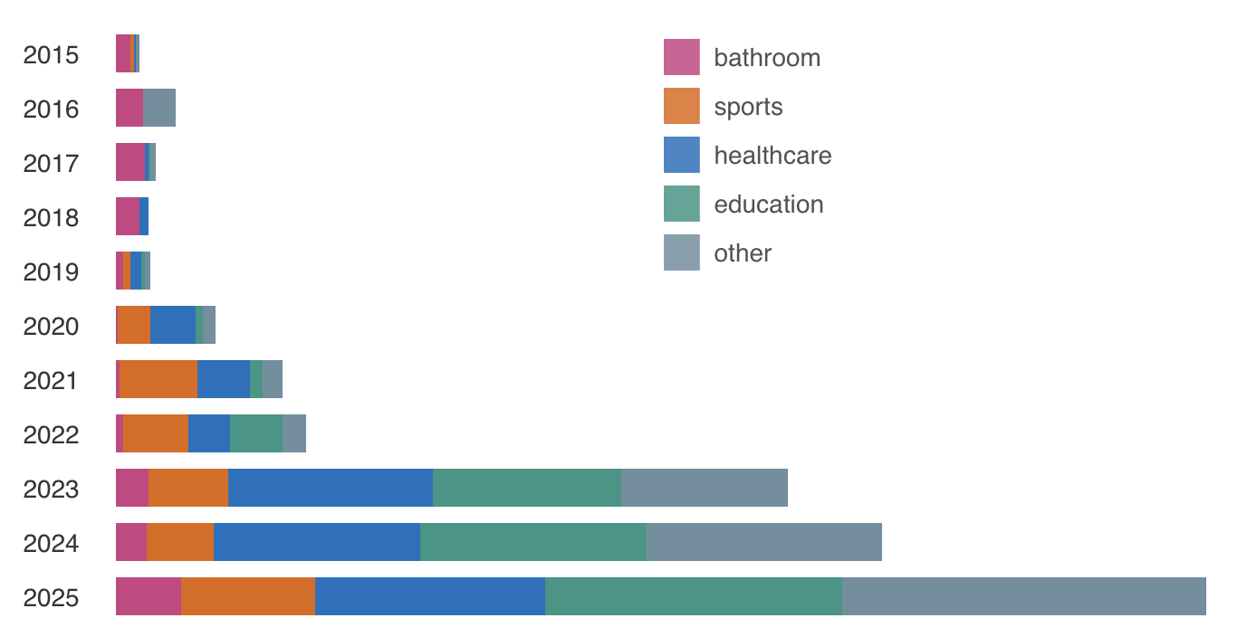 Anti-trans legislation trends in the United States from 2015 to 2025.